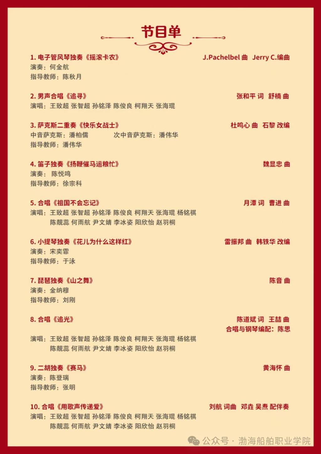 10月17日,沈阳音乐学院附中、声乐歌剧系“红色文艺轻骑兵”进校园渤海船舶职业学院专场音乐会在学术报告厅举行。沈阳音乐学院附中党总支书记胡术艺、声乐歌剧系党总支书记郑洋、附中党总支副书记谢晓宇,我校纪委书记、监察专员侯哲,党委委员、党办主任李辉,学校团委、各相关部门负责同志,各二级学院分团委书记,学校美育教师及学生代表共同观看演出。活动通过学校官方视频号实时直播,全校师生在线收看。