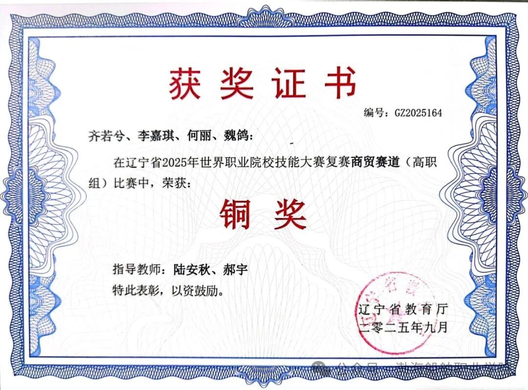 近日,辽宁省2025年世界职业院校技能大赛复赛商贸赛道(高职组)公布成绩。我校经济与管理学院陆安秋、郝宇老师担任指导教师,电子商务专业齐若兮、李嘉琪、魏鸽、何丽同学组成的参赛团队,凭借扎实的专业技能、创新的思维和出色的团队协作,荣获该赛道铜奖。