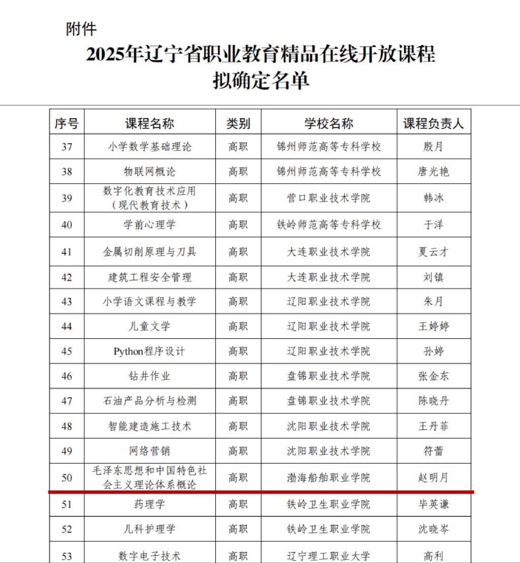 近日,辽宁省教育厅公示了2025年度辽宁省职业教育精品在线开放课程确定名单,经院校申报、材料审核、专家评审等程序,确认80门课程入选。我校马克思主义学院赵明月老师主持的《毛泽东思想和中国特色社会主义理论体系概论》课程成功入选。这是我校思想政治理论课在职业教育课程建设领域取得的又一重要成果。