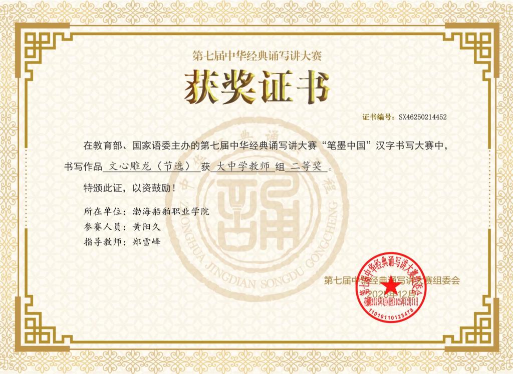 近日,由教育部、国家语委主办的第七届中华经典诵写讲大赛“笔墨中国”汉字书写大赛公布获奖结果,我校师范教育与健康管理学院黄阳久老师的粉笔书法作品《文心雕龙节选》荣获大赛大中学教师组二等奖。